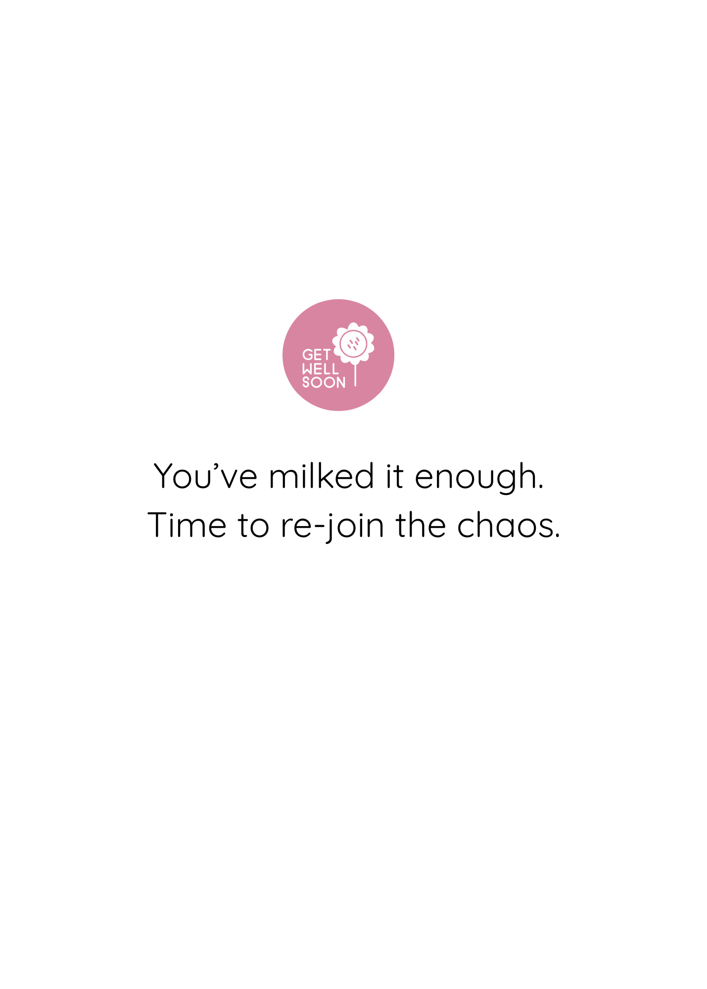 - The inside message reads: "You've milked it enough. Time to rejoin the chaos."